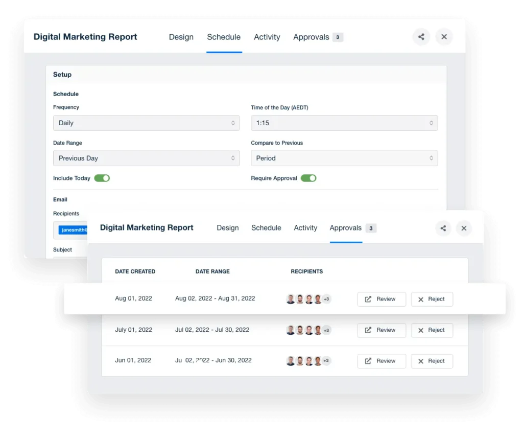 Streamline your client reporting to scale your agency. Set up your marketing reports for each client and put the entire process on autopilot with a simple and scalable report scheduling and approval process.